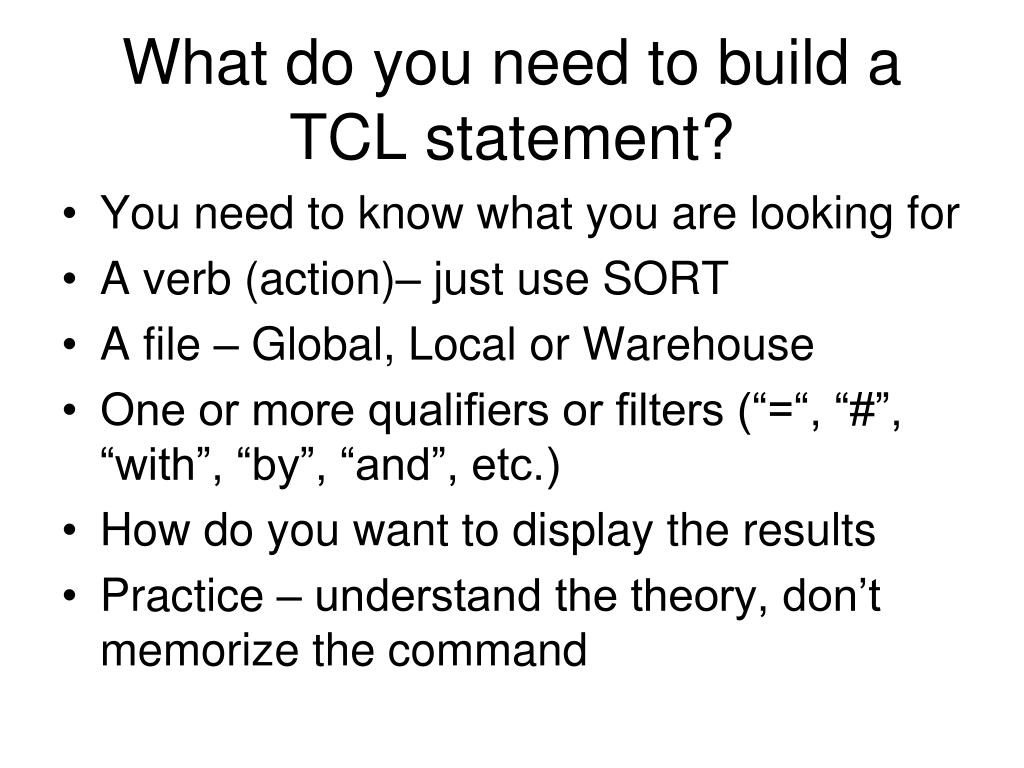 What do you need to build a TCL statement? • You need to know what you are looking for • A verb (action)– just use SORT • A file – Global, Local or Warehouse • One or more qualifiers or filters (“=“, “#”, “with”, “by”, “and”, etc.) • How do you want to display the results • Practice – understand the theory, don’t memorize the command