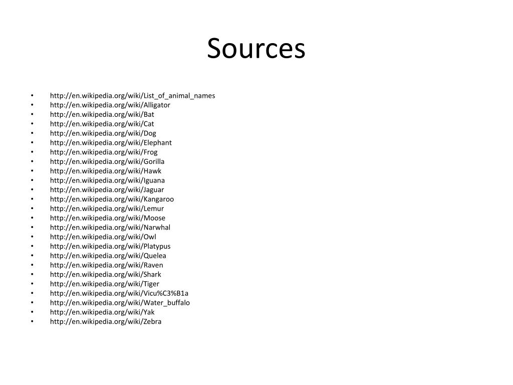 Sources • http://en.wikipedia.org/wiki/List_of_animal_names • http://en.wikipedia.org/wiki/Alligator • http://en.wikipedia.org/wiki/Bat • http://en.wikipedia.org/wiki/Cat • http://en.wikipedia.org/wiki/Dog • http://en.wikipedia.org/wiki/Elephant • http://en.wikipedia.org/wiki/Frog • http://en.wikipedia.org/wiki/Gorilla • http://en.wikipedia.org/wiki/Hawk • http://en.wikipedia.org/wiki/Iguana • http://en.wikipedia.org/wiki/Jaguar • http://en.wikipedia.org/wiki/Kangaroo • http://en.wikipedia.org/wiki/Lemur • http://en.wikipedia.org/wiki/Moose • http://en.wikipedia.org/wiki/Narwhal • http://en.wikipedia.org/wiki/Owl • http://en.wikipedia.org/wiki/Platypus • http://en.wikipedia.org/wiki/Quelea • http://en.wikipedia.org/wiki/Raven • http://en.wikipedia.org/wiki/Shark • http://en.wikipedia.org/wiki/Tiger • http://en.wikipedia.org/wiki/Vicu%C3%B1a • http://en.wikipedia.org/wiki/Water_buffalo • http://en.wikipedia.org/wiki/Yak • http://en.wikipedia.org/wiki/Zebra