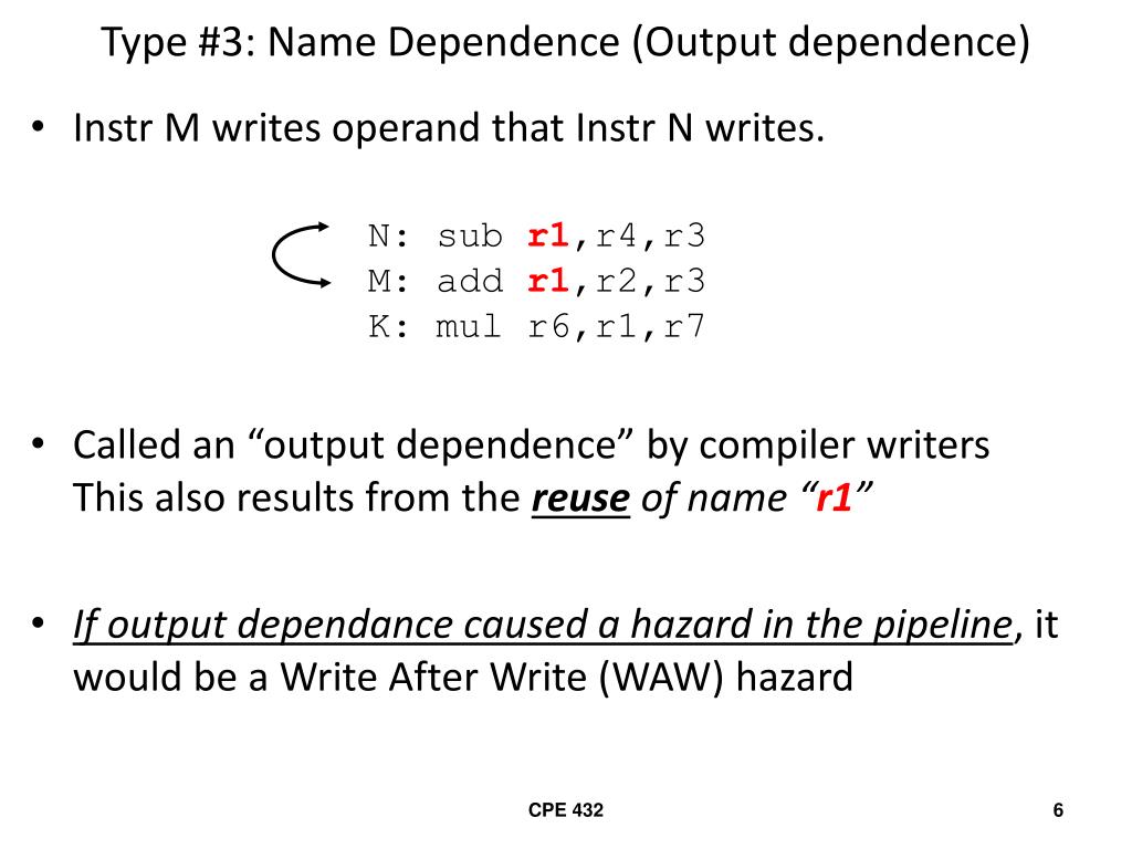 N: sub r1,r4,r3 M: add r1,r2,r3 K: mul r6,r1,r7 Type #3: Name Dependence (Output dependence) • Instr M writes operand that Instr N writes. • Called an “output dependence” by compiler writersThis also results from the reuse of name “r1” • If outputdependance caused a hazard in the pipeline, it would be a Write After Write (WAW) hazard CPE 432