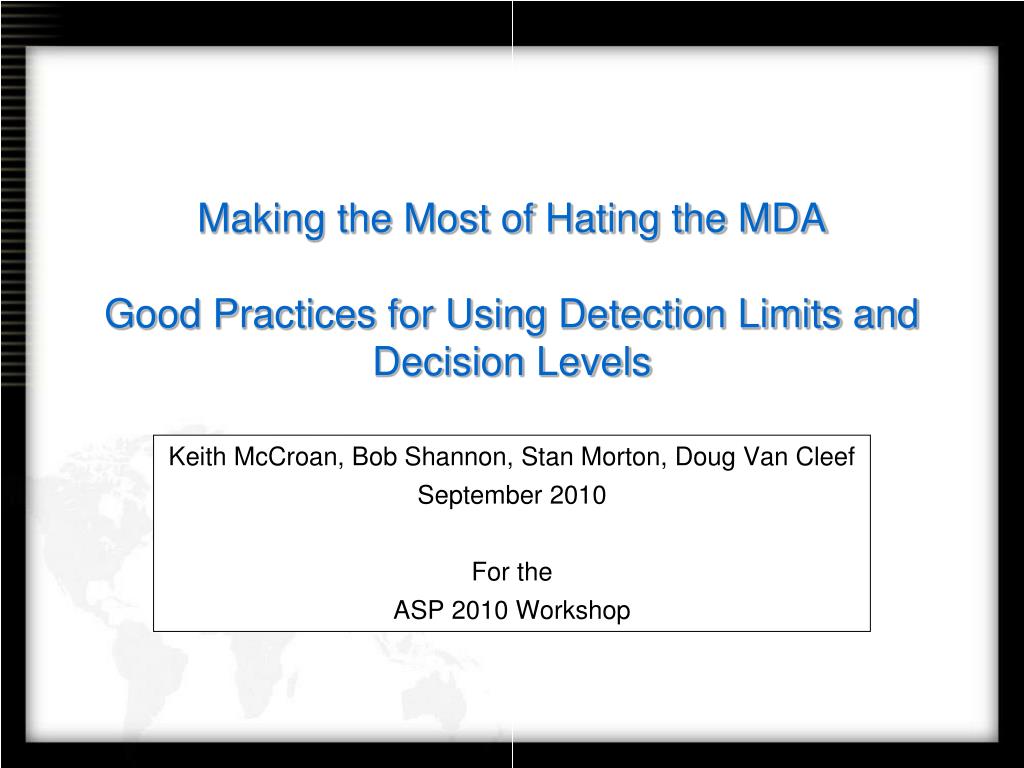 Making the Most of Hating the MDAGood Practices for Using Detection Limits and Decision Levels Keith McCroan, Bob Shannon, Stan Morton, Doug Van Cleef September 2010 For the ASP 2010 Workshop
