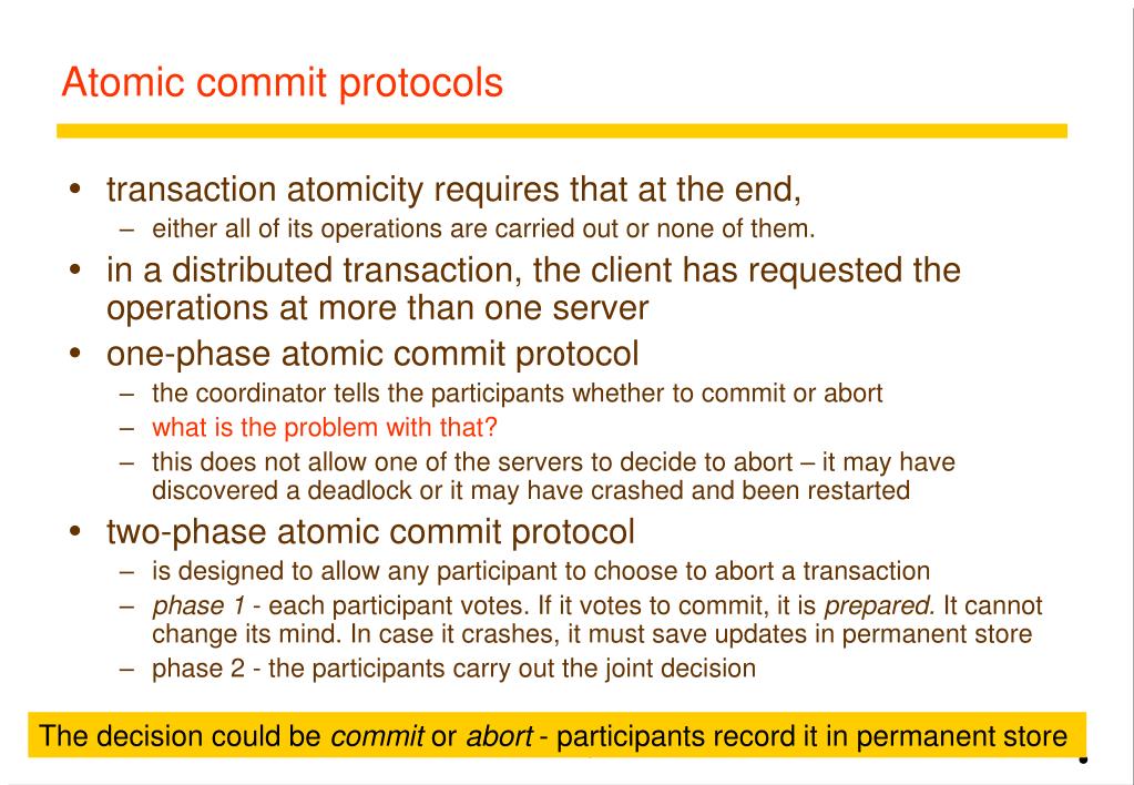 Atomic commit protocols • transaction atomicity requires that at the end, • either all of its operations are carried out or none of them. • in a distributed transaction, the client has requested the operations at more than one server • one-phase atomic commit protocol • the coordinator tells the participants whether to commit or abort • what is the problem with that? • this does not allow one of the servers to decide to abort – it may have discovered a deadlock or it may have crashed and been restarted • two-phase atomic commit protocol • is designed to allow any participant to choose to abort a transaction • phase 1 - each participant votes. If it votes to commit, it is prepared. It cannot change its mind. In case it crashes, it must save updates in permanent store • phase 2 - the participants carry out the joint decision The decision could be commit or abort - participants record it in permanent store • 8