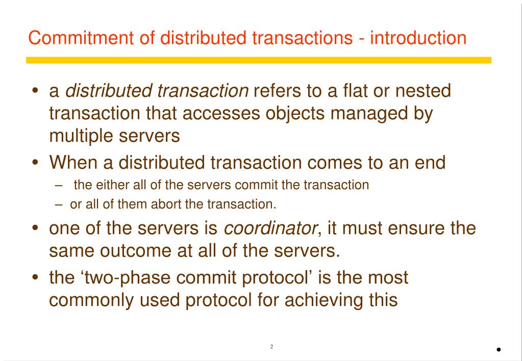 Commitment of distributed transactions - introduction • a distributed transaction refers to a flat or nested transaction that accesses objects managed by multiple servers • When a distributed transaction comes to an end • the either all of the servers commit the transaction • or all of them abort the transaction. • one of the servers is coordinator, it must ensure the same outcome at all of the servers. • the ‘two-phase commit protocol’ is the most commonly used protocol for achieving this 2 •