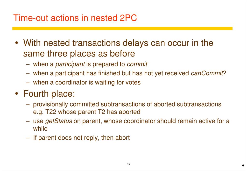 Time-out actions in nested 2PC • With nested transactions delays can occur in the same three places as before • when a participant is prepared to commit • when a participant has finished but has not yet received canCommit? • when a coordinator is waiting for votes • Fourth place: • provisionally committed subtransactions of aborted subtransactions e.g. T22 whose parent T2 has aborted • use getStatus on parent, whose coordinator should remain active for a while • If parent does not reply, then abort • 26