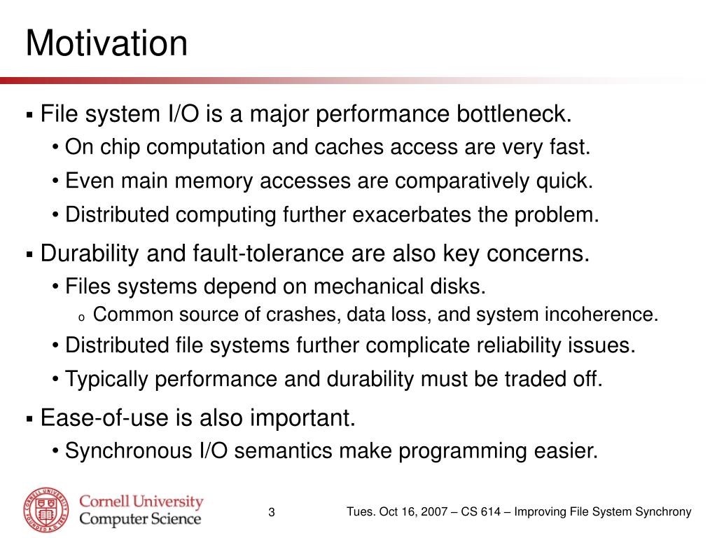 Motivation • File system I/O is a major performance bottleneck. • On chip computation and caches access are very fast. • Even main memory accesses are comparatively quick. • Distributed computing further exacerbates the problem. • Durability and fault-tolerance are also key concerns. • Files systems depend on mechanical disks. • Common source of crashes, data loss, and system incoherence. • Distributed file systems further complicate reliability issues. • Typically performance and durability must be traded off. • Ease-of-use is also important. • Synchronous I/O semantics make programming easier. Tues. Oct 16, 2007 – CS 614 – Improving File System Synchrony