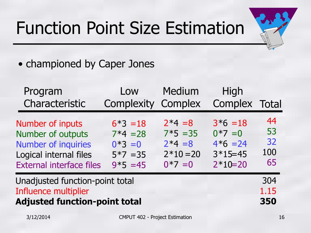 Program Characteristic Low Complexity Medium Complex High Complex Total 44 53 32 100 65 2 =8 3 =18 Number of inputs Number of outputs Number of inquiries Logical internal files External interface files 6 =18 7 =35 0 =0 7 =28 2 =8 4 =24 0 =0 2 =20 3 =45 5 =35 0 =0 2 =20 9 =45 304 1.15 350 Unadjusted function-point total Influence multiplier Adjusted function-point total Function Point Size Estimation • championed by Caper Jones *4 *5 *4 *10 *7 *6 *7 *6 *15 *10 *3 *4 *3 *7 *5 CMPUT 402 - Project Estimation