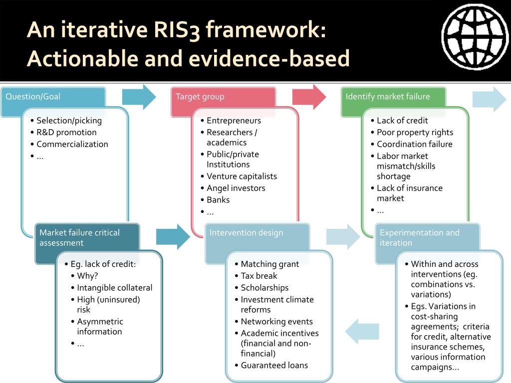 Developing your RIS3:Finding one’s niche, together • Create enabling environment for efficient market selection • Promote entrepreneurship across the board • Successful companies will constitute the new specialization of the country/region (self-discovery) • Develop a flexible strategy and integrate iterative learning • Focus on measurable intermediate goals • Identify bottlenecks and market failures • Experiment, learn, adapt
