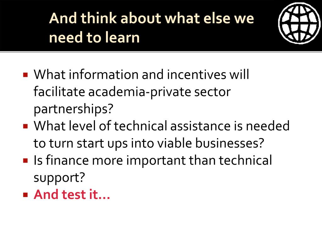 And think about what else we need to learn • What information and incentives will facilitate academia-private sector partnerships? • What level of technical assistance is needed to turn start ups into viable businesses? • Is finance more important than technical support? • And test it…
