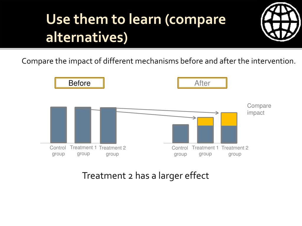 Use them to learn (compare alternatives) Compare the impact of different mechanisms before and after the intervention. Before After Compare impact Treatment 1 group Control group Treatment 1 group Treatment 2 group Treatment 2 group Control group Treatment 2 has a larger effect
