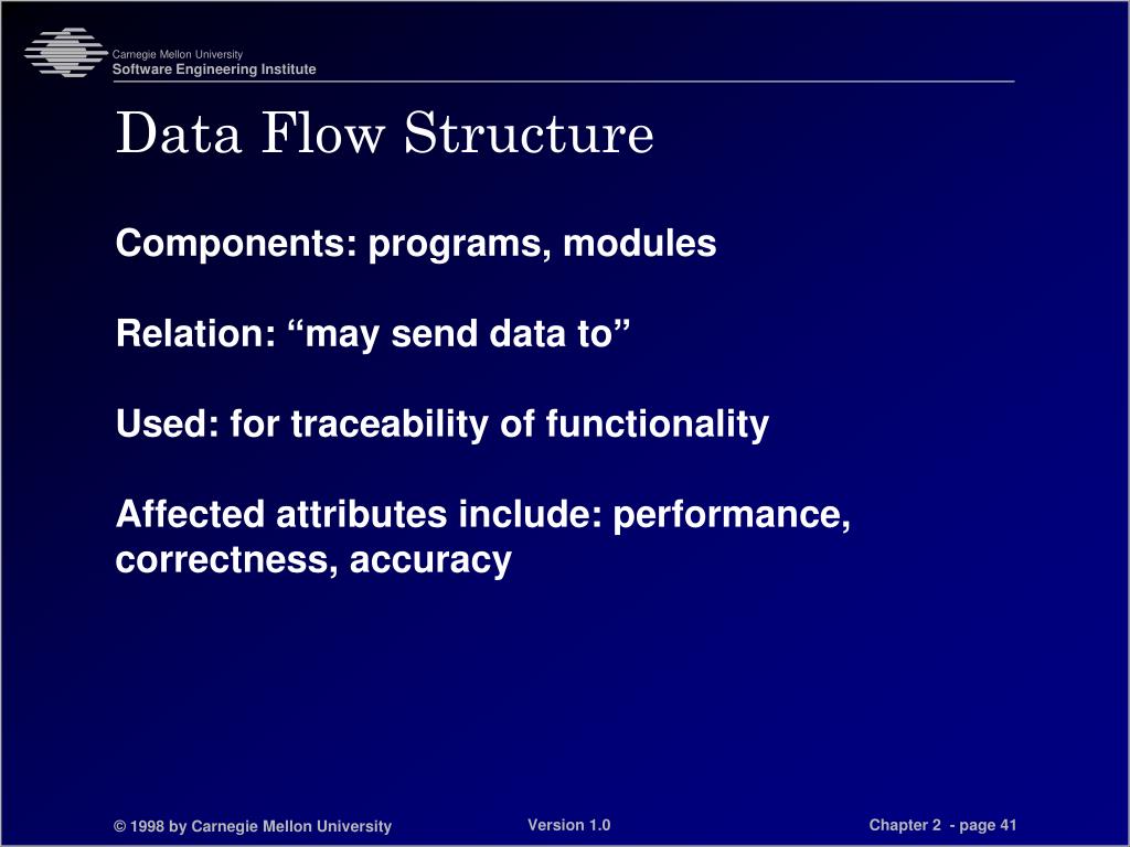 Data Flow Structure • Components: programs, modules • Relation: “may send data to” • Used: for traceability of functionality • Affected attributes include: performance, correctness, accuracy