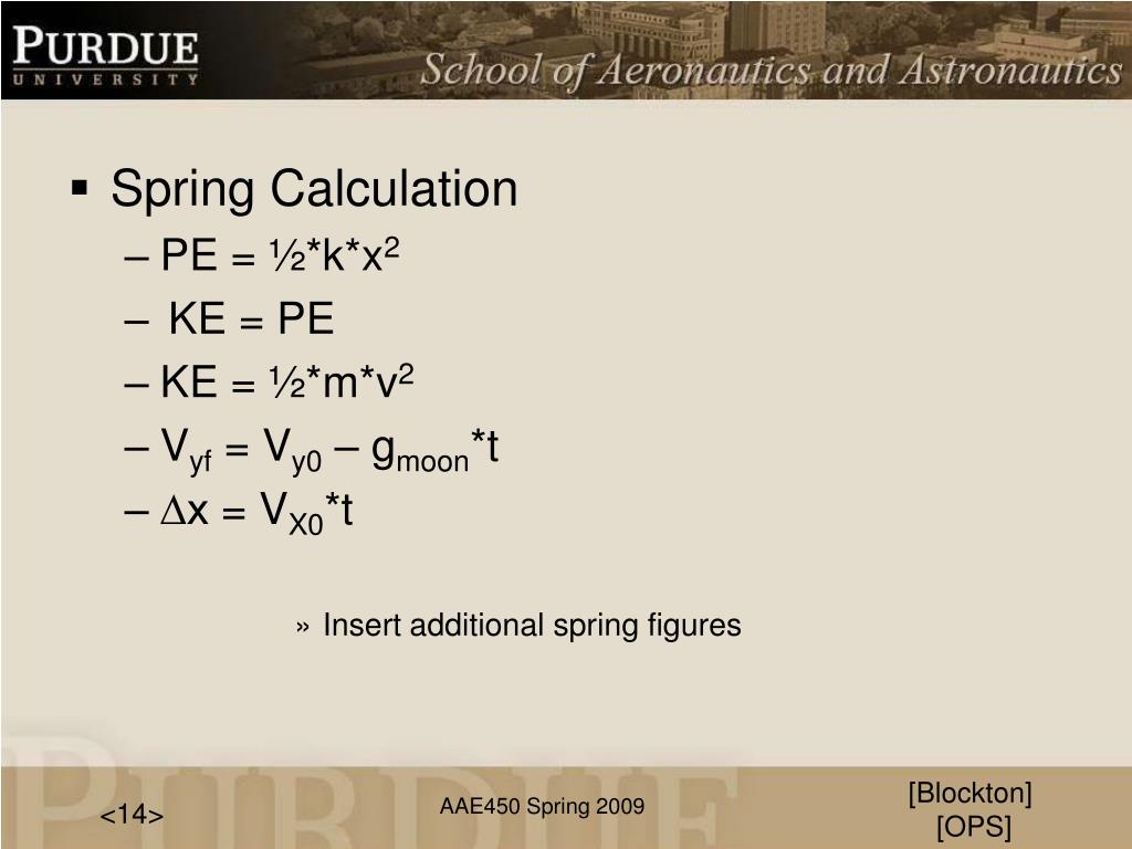 [Blockton] [OPS] • Spring Calculation • PE = ½*k*x2 • KE = PE • KE = ½*m*v2 • Vyf = Vy0 – gmoon*t • ∆x = VX0*t • Insert additional spring figures