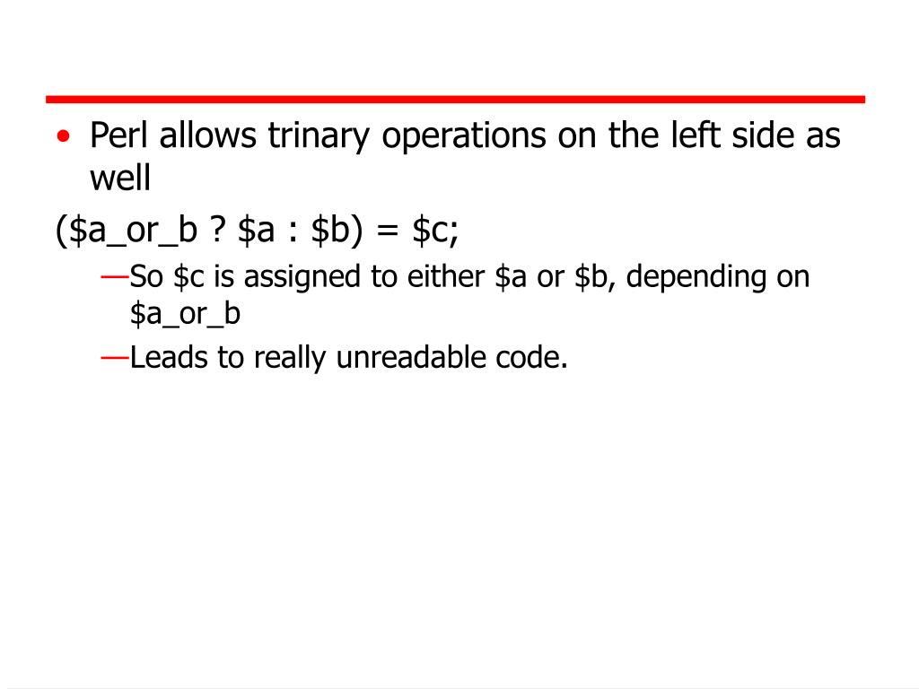 Perl allows trinary operations on the left side as well ($a_or_b ? $a : $b) = $c; • So $c is assigned to either $a or $b, depending on $a_or_b • Leads to really unreadable code.