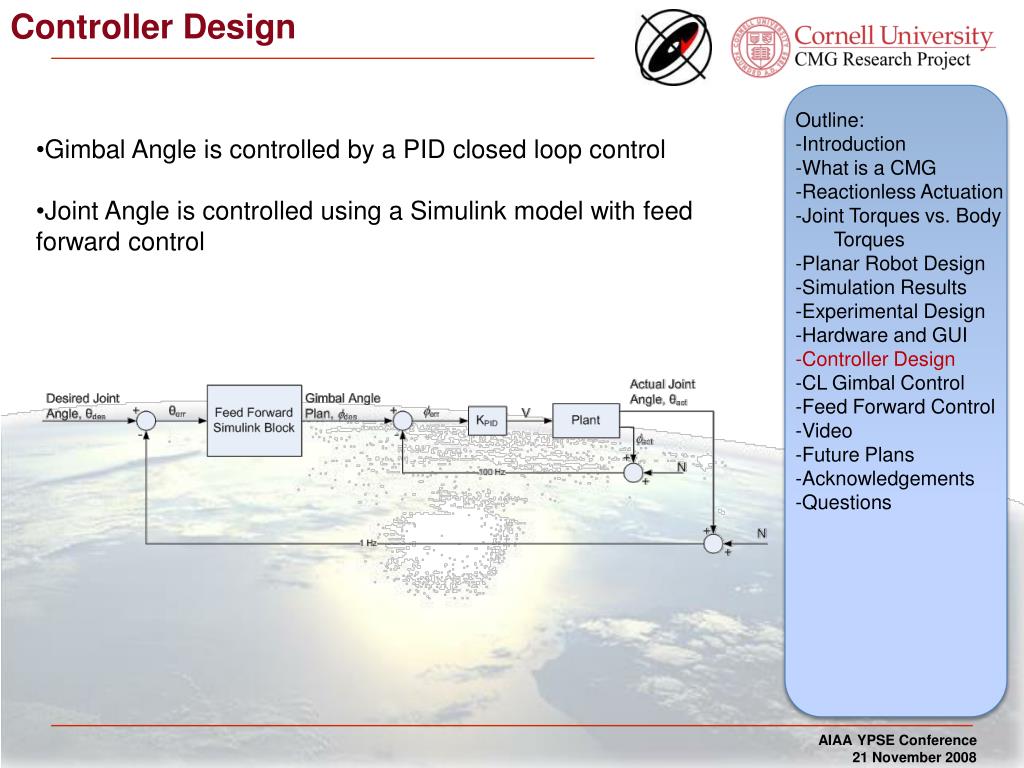 Controller Design Outline: -Introduction -What is a CMG -Reactionless Actuation -Joint Torques vs. Body Torques -Planar Robot Design -Simulation Results -Experimental Design -Hardware and GUI -Controller Design -CL Gimbal Control -Feed Forward Control -Video -Future Plans -Acknowledgements -Questions • Gimbal Angle is controlled by a PID closed loop control • Joint Angle is controlled using a Simulink model with feed forward control