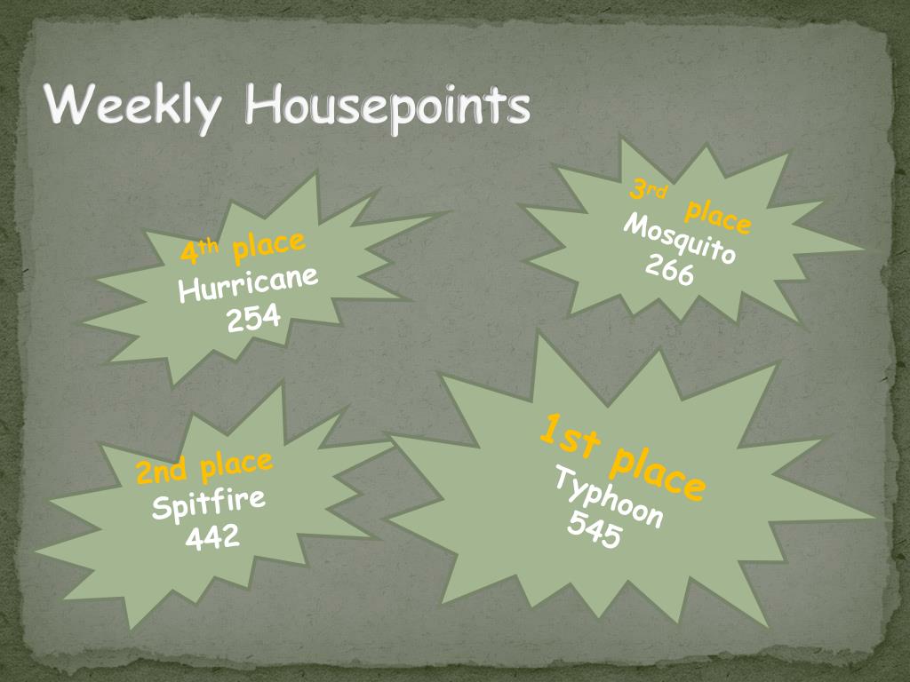 Weekly Housepoints 3rd place Mosquito 266 4th place Hurricane 254 1st place Typhoon 545 2nd place Spitfire 442