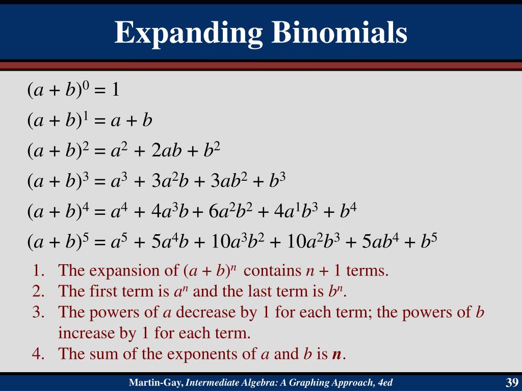 Expanding Binomials (a + b)0 = 1(a + b)1 = a + b(a + b)2 = a2 + 2ab + b2(a + b)3 = a3 + 3a2b + 3ab2 + b3(a + b)4 = a4 + 4a3b+ 6a2b2 + 4a1b3 + b4(a + b)5 = a5 + 5a4b + 10a3b2 + 10a2b3 + 5ab4 + b5 Expanding a binomial such as (a + b)n means to write the factored form as a sum. 1 term 2 terms 3 terms 4 terms 5 terms 6 terms