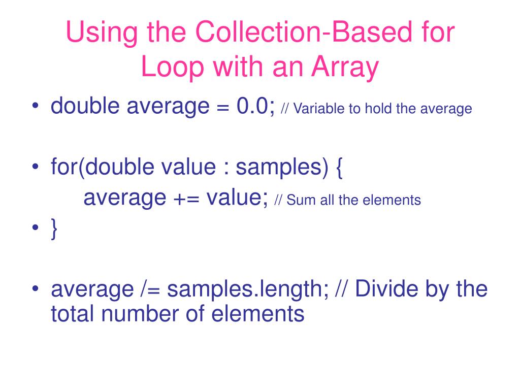 Using the Collection-Based for Loop with an Array • double average = 0.0; // Variable to hold the average • for(double value : samples) { average += value; // Sum all the elements • } • average /= samples.length; // Divide by the total number of elements