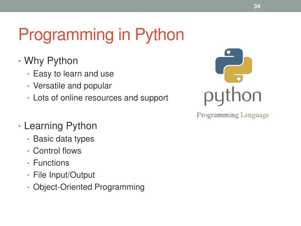 Programming in Python • Why Python • Easy to learn and use • Versatile and popular • Lots of online resources and support • Learning Python • Basic data types • Control flows • Functions • File Input/Output • Object-Oriented Programming