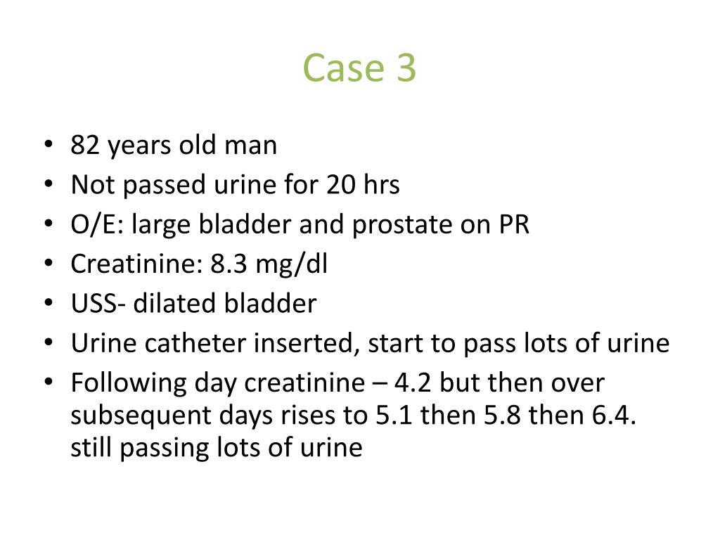 Case 3 • 82 years old man • Not passed urine for 20 hrs • O/E: large bladder and prostate on PR • Creatinine: 8.3 mg/dl • USS- dilated bladder • Urine catheter inserted, start to pass lots of urine • Following day creatinine – 4.2 but then over subsequent days rises to 5.1 then 5.8 then 6.4. still passing lots of urine