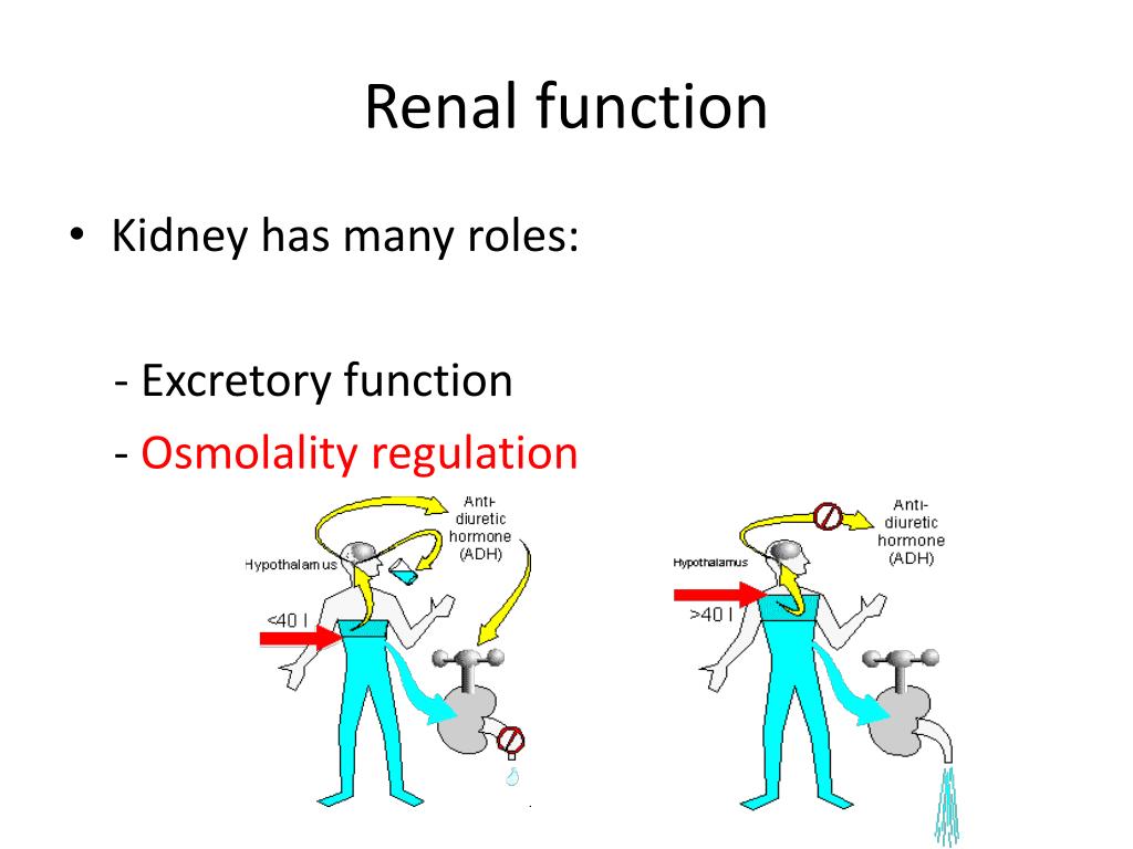Renal function • Kidney has many roles: - Excretory function - Osmolality regulation
