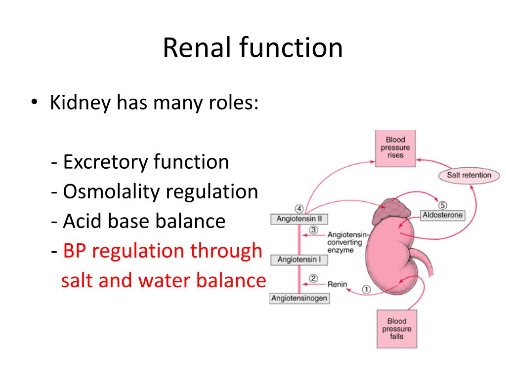 Renal function • Kidney has many roles: - Excretory function - Osmolality regulation - Acid base balance - BP regulation through salt and water balance