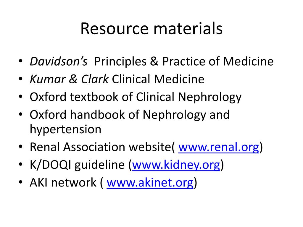 Resource materials • Davidson’s Principles & Practice of Medicine • Kumar & Clark Clinical Medicine • Oxford textbook of Clinical Nephrology • Oxford handbook of Nephrology and hypertension • Renal Association website( www.renal.org) • K/DOQI guideline (www.kidney.org) • AKI network ( www.akinet.org)