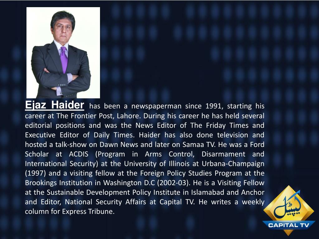 Ejaz Haiderhas been a newspaperman since 1991, starting his career at The Frontier Post, Lahore. During his career he has held several editorial positions and was the News Editor of The Friday Times and Executive Editor of Daily Times. Haider has also done television and hosted a talk-show on Dawn News and later on Samaa TV. He was a Ford Scholar at ACDIS (Program in Arms Control, Disarmament and International Security) at the University of Illinois at Urbana-Champaign (1997) and a visiting fellow at the Foreign Policy Studies Program at the Brookings Institution in Washington D.C (2002-03). He is a Visiting Fellow at the Sustainable Development Policy Institute in Islamabad and Anchor and Editor, National Security Affairs at Capital TV. He writes a weekly column for Express Tribune. .