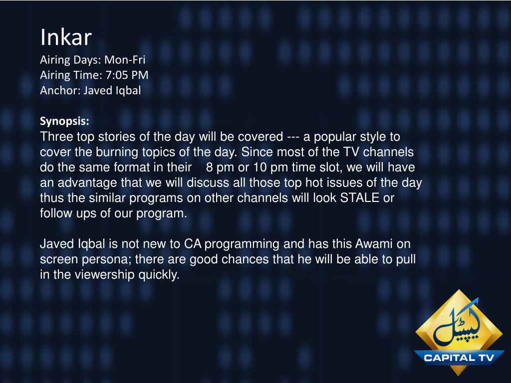 Inkar Airing Days: Mon-Fri Airing Time: 7:05 PM Anchor: Javed Iqbal Synopsis: Three top stories of the day will be covered --- a popular style to cover the burning topics of the day. Since most of the TV channels do the same format in their 8 pm or 10 pm time slot, we will have an advantage that we will discuss all those top hot issues of the day thus the similar programs on other channels will look STALE or follow ups of our program. Javed Iqbal is not new to CA programming and has this Awami on screen persona; there are good chances that he will be able to pull in the viewership quickly. .