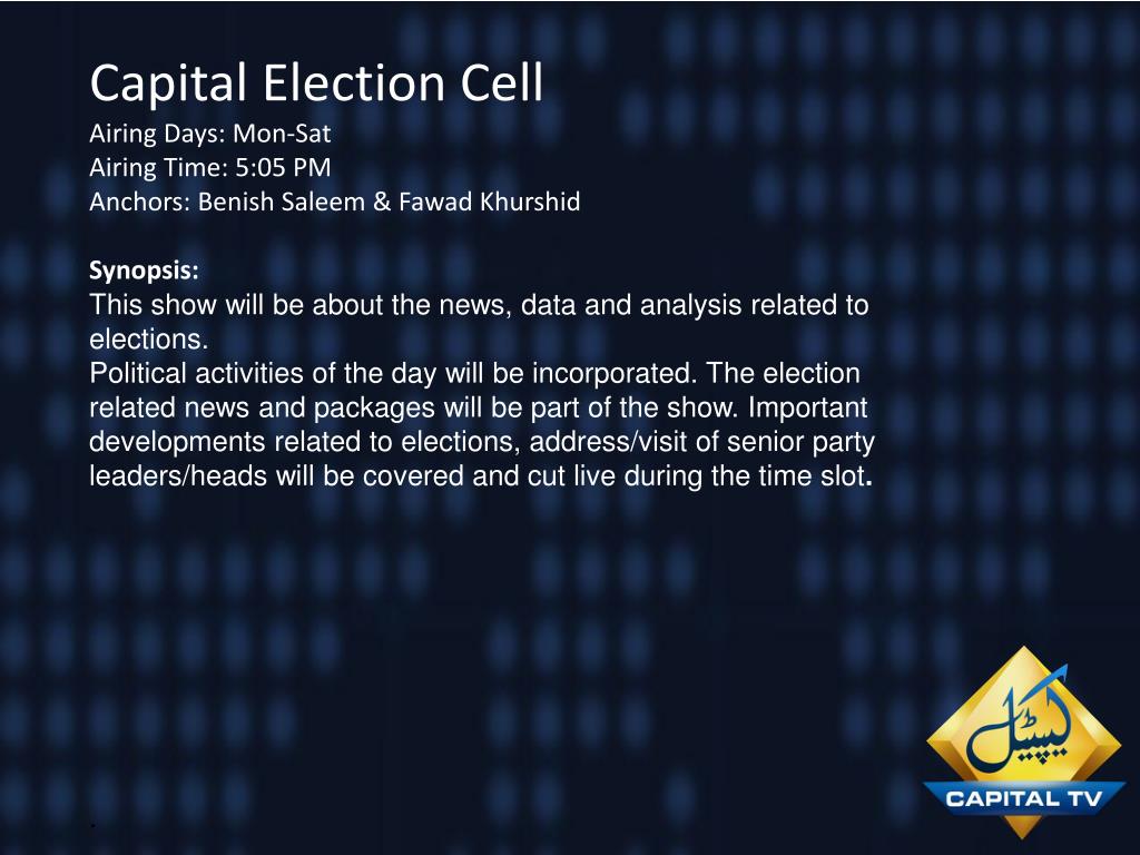 Capital Election Cell Airing Days: Mon-Sat Airing Time: 5:05 PM Anchors: BenishSaleem & FawadKhurshid Synopsis: This show will be about the news, data and analysis related to elections. Political activities of the day will be incorporated. The election related news and packages will be part of the show. Important developments related to elections, address/visit of senior party leaders/heads will be covered and cut live during the time slot. .
