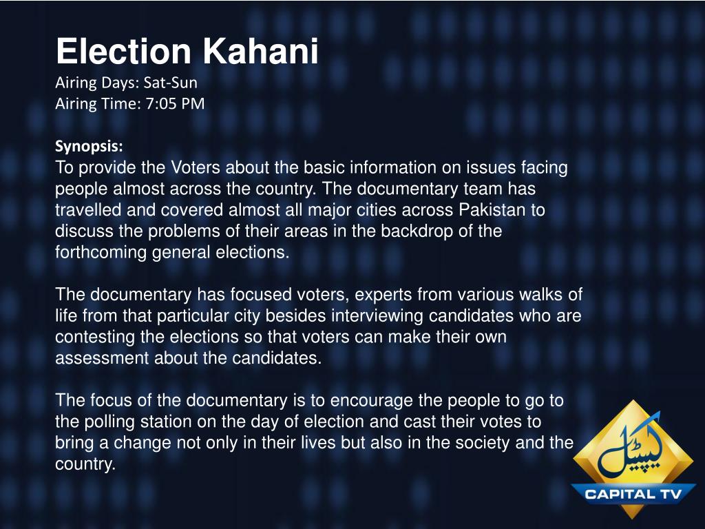 Election Kahani Airing Days: Sat-Sun Airing Time: 7:05 PM Synopsis: To provide the Voters about the basic information on issues facing people almost across the country. The documentary team has travelled and covered almost all major cities across Pakistan to discuss the problems of their areas in the backdrop of the forthcoming general elections. The documentary has focused voters, experts from various walks of life from that particular city besides interviewing candidates who are contesting the elections so that voters can make their own assessment about the candidates. The focus of the documentary is to encourage the people to go to the polling station on the day of election and cast their votes to bring a change not only in their lives but also in the society and the country. .