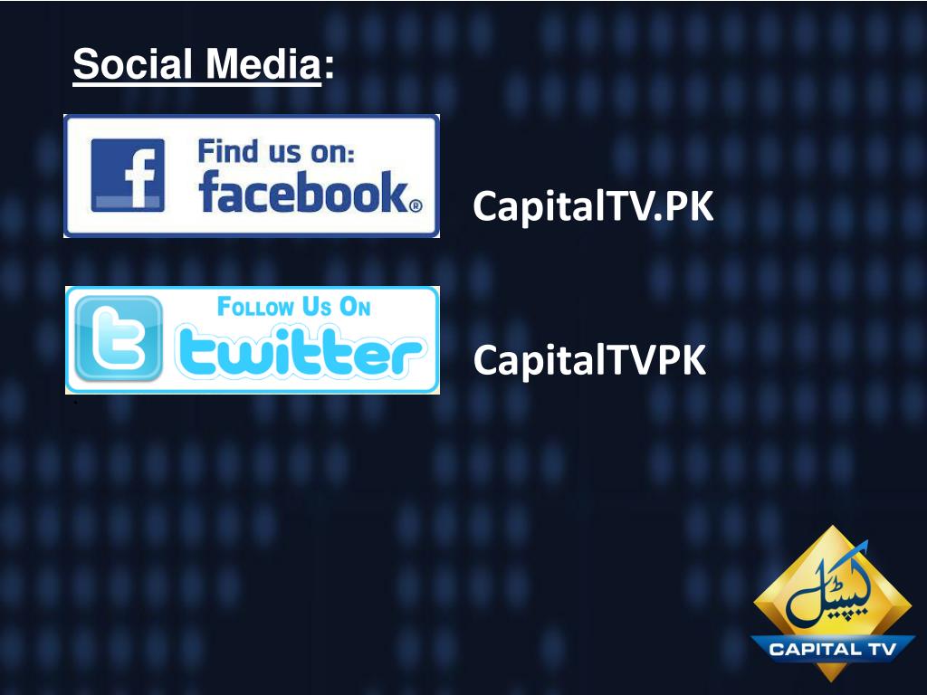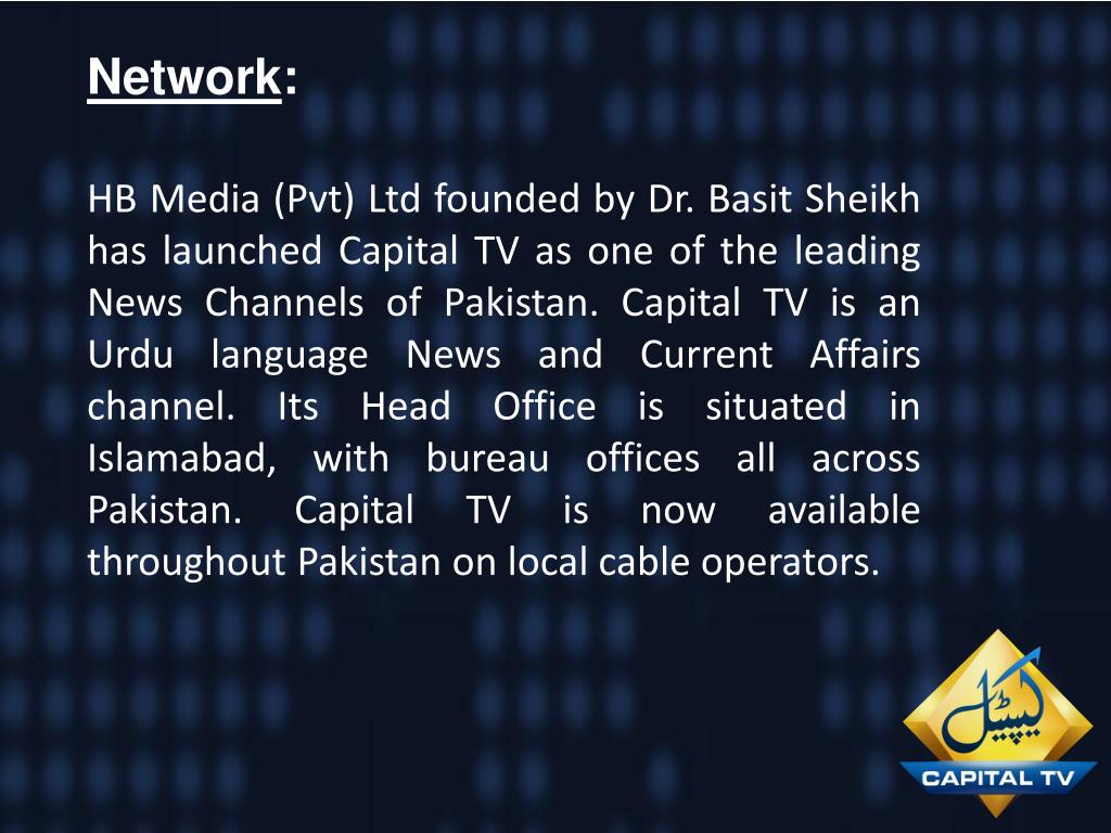 Network: HB Media (Pvt) Ltd founded by Dr. Basit Sheikh has launched Capital TV as one of the leading News Channels of Pakistan. Capital TV is an Urdu language News and Current Affairs channel. Its Head Office is situated in Islamabad, with bureau offices all across Pakistan. Capital TV is now available throughout Pakistan on local cable operators.