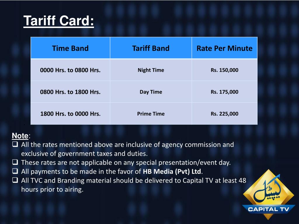 Tariff Card: . • Note: • All the rates mentioned above are inclusive of agency commission and exclusive of government taxes and duties. • These rates are not applicable on any special presentation/event day. • All payments to be made in the favor of HB Media (Pvt) Ltd. • All TVC and Branding material should be delivered to Capital TV at least 48 hours prior to airing.