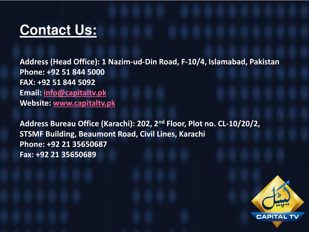 Contact Us: Address (Head Office): 1 Nazim-ud-Din Road, F-10/4, Islamabad, Pakistan Phone: +92 51 844 5000 FAX: +92 51 844 5092Email: info@capitaltv.pkWebsite: www.capitaltv.pk Address Bureau Office (Karachi): 202, 2nd Floor, Plot no. CL-10/20/2, STSMF Building, Beaumont Road, Civil Lines, Karachi Phone: +92 21 35650687 Fax: +92 21 35650689