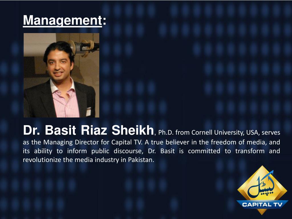 Management: Dr. Basit Riaz Sheikh, Ph.D. from Cornell University, USA, serves as the Managing Director for Capital TV. A true believer in the freedom of media, and its ability to inform public discourse, Dr. Basit is committed to transform and revolutionize the media industry in Pakistan.
