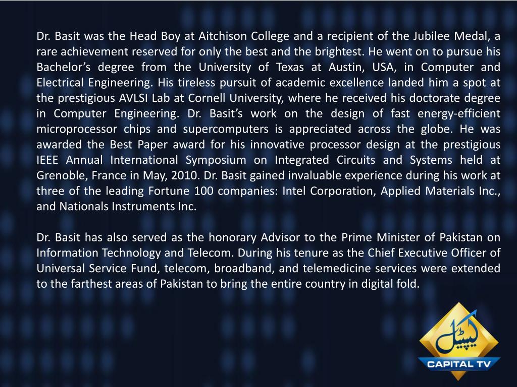 Dr. Basit was the Head Boy at Aitchison College and a recipient of the Jubilee Medal, a rare achievement reserved for only the best and the brightest. He went on to pursue his Bachelor’s degree from the University of Texas at Austin, USA, in Computer and Electrical Engineering. His tireless pursuit of academic excellence landed him a spot at the prestigious AVLSI Lab at Cornell University, where he received his doctorate degree in Computer Engineering. Dr. Basit’s work on the design of fast energy-efficient microprocessor chips and supercomputers is appreciated across the globe. He was awarded the Best Paper award for his innovative processor design at the prestigious IEEE Annual International Symposium on Integrated Circuits and Systems held at Grenoble, France in May, 2010. Dr. Basit gained invaluable experience during his work at three of the leading Fortune 100 companies: Intel Corporation, Applied Materials Inc., and Nationals Instruments Inc. Dr. Basit has also served as the honorary Advisor to the Prime Minister of Pakistan on Information Technology and Telecom. During his tenure as the Chief Executive Officer of Universal Service Fund, telecom, broadband, and telemedicine services were extended to the farthest areas of Pakistan to bring the entire country in digital fold.
