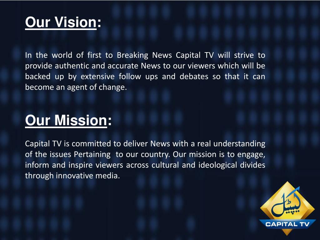 Our Vision: In the world of first to Breaking News Capital TV will strive to provide authentic and accurate News to our viewers which will be backed up by extensive follow ups and debates so that it can become an agent of change. Our Mission: Capital TV is committed to deliver News with a real understanding of the issues Pertaining to our country. Our mission is to engage, inform and inspire viewers across cultural and ideological divides through innovative media.