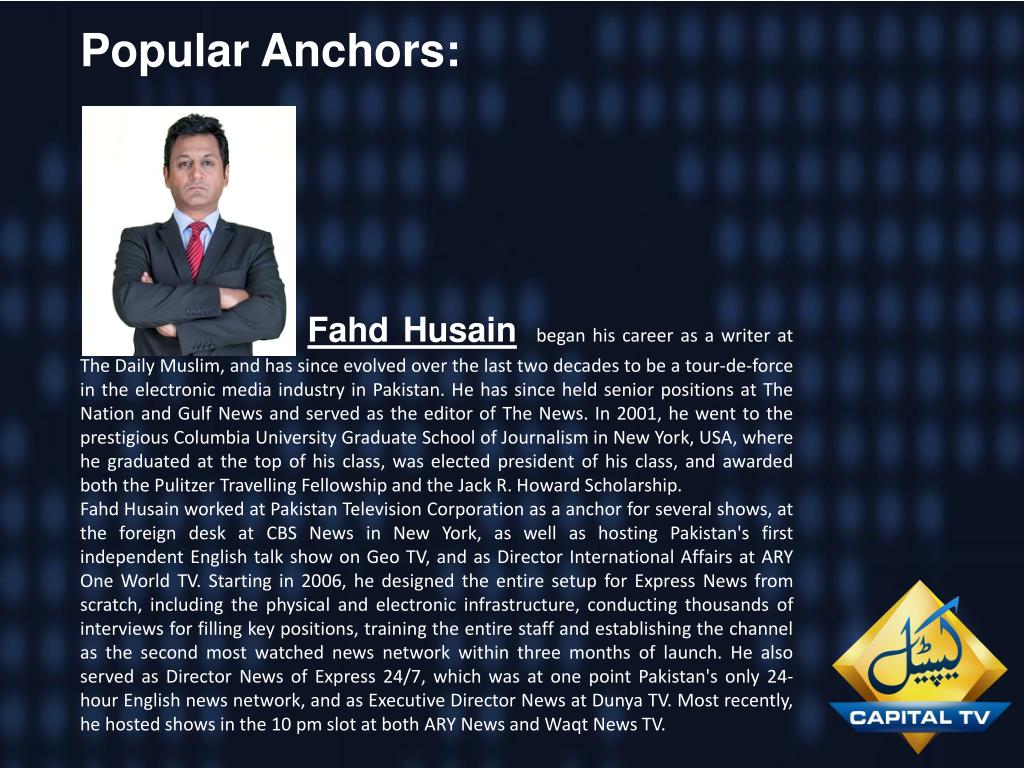 Popular Anchors: Fahd Husainbegan his career as a writer at The Daily Muslim, and has since evolved over the last two decades to be a tour-de-force in the electronic media industry in Pakistan. He has since held senior positions at The Nation and Gulf News and served as the editor of The News. In 2001, he went to the prestigious Columbia University Graduate School of Journalism in New York, USA, where he graduated at the top of his class, was elected president of his class, and awarded both the Pulitzer Travelling Fellowship and the Jack R. Howard Scholarship. Fahd Husain worked at Pakistan Television Corporation as a anchor for several shows, at the foreign desk at CBS News in New York, as well as hosting Pakistan's first independent English talk show on Geo TV, and as Director International Affairs at ARY One World TV. Starting in 2006, he designed the entire setup for Express News from scratch, including the physical and electronic infrastructure, conducting thousands of interviews for filling key positions, training the entire staff and establishing the channel as the second most watched news network within three months of launch. He also served as Director News of Express 24/7, which was at one point Pakistan's only 24-hour English news network, and as Executive Director News at Dunya TV. Most recently, he hosted shows in the 10 pm slot at both ARY News and Waqt News TV.