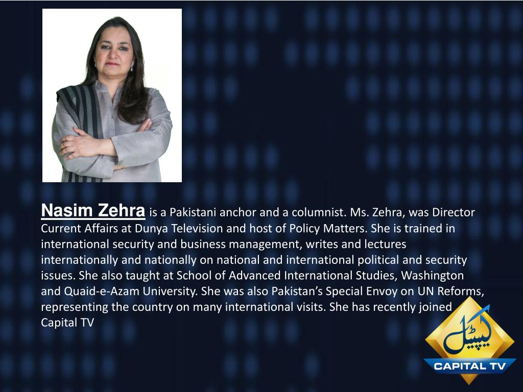 Nasim Zehrais a Pakistani anchor and a columnist. Ms. Zehra, was Director Current Affairs at Dunya Television and host of Policy Matters. She is trained in international security and business management, writes and lectures internationally and nationally on national and international political and security issues. She also taught at School of Advanced International Studies, Washington and Quaid-e-AzamUniversity. She was also Pakistan’s Special Envoy on UN Reforms, representing the country on many international visits. She has recently joined Capital TV .