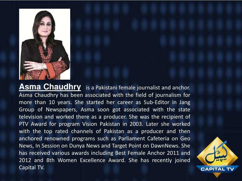 Asma Chaudhryis a Pakistani female journalist and anchor. Asma Chaudhry has been associated with the field of journalism for more than 10 years. She started her career as Sub-Editor in Jang Group of Newspapers, Asma soon got associated with the state television and worked there as a producer. She was the recipient of PTV Award for program Vision Pakistan in 2003. Later she worked with the top rated channels of Pakistan as a producer and then anchored renowned programs such as Parliament Cafeteria on Geo News, In Session on Dunya News and Target Point on DawnNews. She has received various awards including Best Female Anchor 2011 and 2012 and 8th Women Excellence Award. She has recently joined Capital TV. .