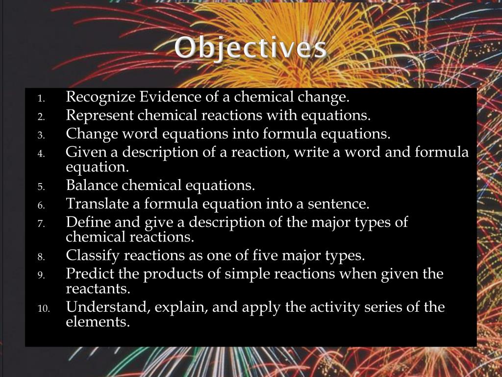 Objectives • Recognize Evidence of a chemical change. • Represent chemical reactions with equations. • Change word equations into formula equations. • Given a description of a reaction, write a word and formula equation. • Balance chemical equations. • Translate a formula equation into a sentence. • Define and give a description of the major types of chemical reactions. • Classify reactions as one of five major types. • Predict the products of simple reactions when given the reactants. • Understand, explain, and apply the activity series of the elements.