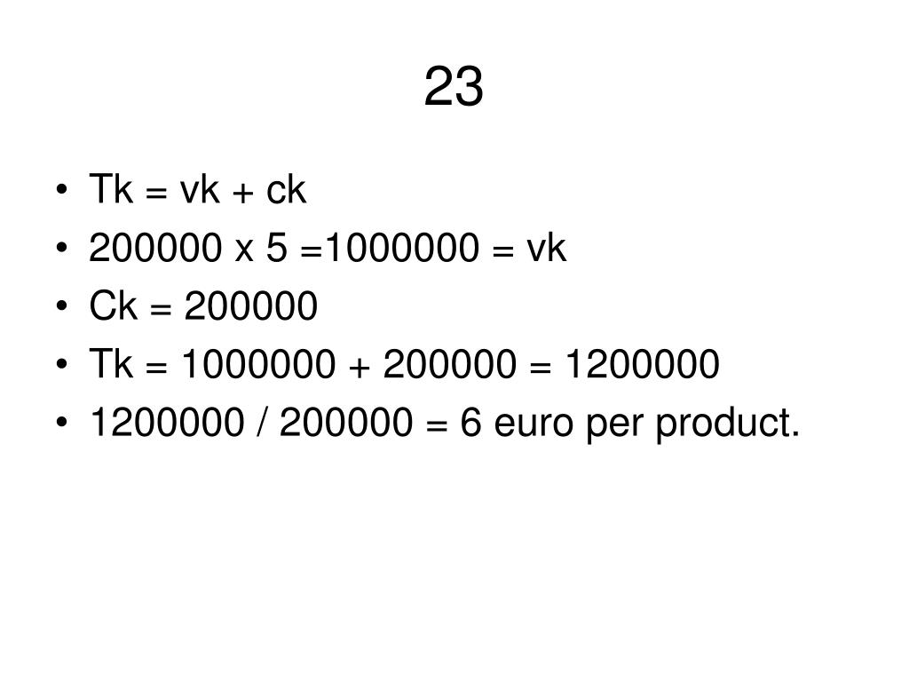 23 • Tk = vk + ck • 200000 x 5 =1000000 = vk • Ck = 200000 • Tk = 1000000 + 200000 = 1200000 • 1200000 / 200000 = 6 euro per product.