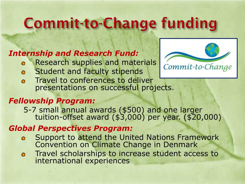Commit-to-Change funding Internship and Research Fund: • Research supplies and materials • Student and faculty stipends • Travel to conferences to deliver presentations on successful projects. Fellowship Program: 5-7 small annual awards ($500) and one larger tuition-offset award ($3,000) per year. ($20,000) Global Perspectives Program: • Support to attend the United Nations Framework Convention on Climate Change in Denmark • Travel scholarships to increase student access to international experiences