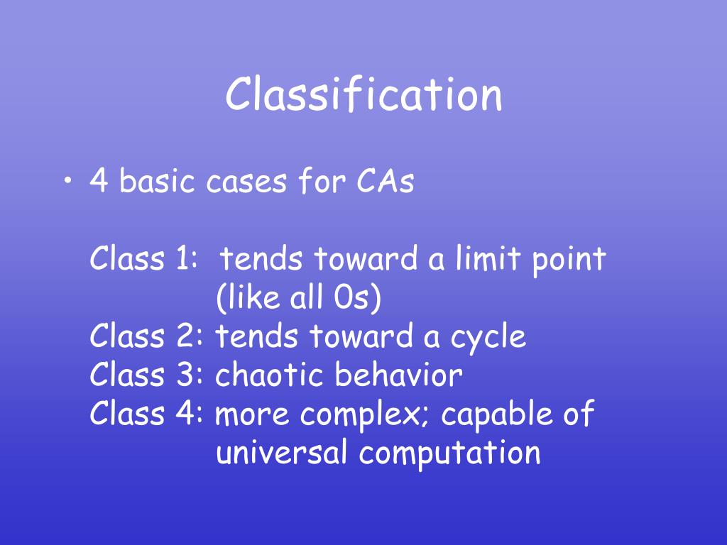 Classification • 4 basic cases for CAsClass 1: tends toward a limit point (like all 0s)Class 2: tends toward a cycle Class 3: chaotic behaviorClass 4: more complex; capable of universal computation