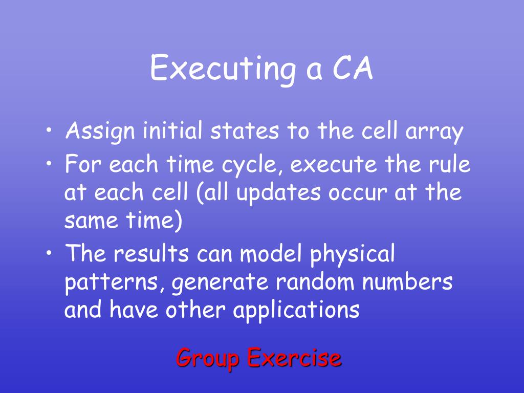 Executing a CA • Assign initial states to the cell array • For each time cycle, execute the rule at each cell (all updates occur at the same time) • The results can model physical patterns, generate random numbers and have other applications Group Exercise