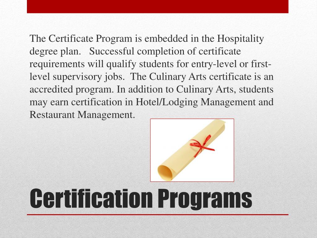 The Certificate Program is embedded in the Hospitality degree plan. Successful completion of certificate requirements will qualify students for entry-level or first-level supervisory jobs. The Culinary Arts certificate is an accredited program. In addition to Culinary Arts, students may earn certification in Hotel/Lodging Management and Restaurant Management. Certification Programs
