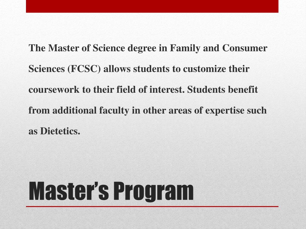The Master of Science degree in Family and Consumer Sciences (FCSC) allows students to customize their coursework to their field of interest. Students benefit from additional faculty in other areas of expertise such as Dietetics. Master’s Program