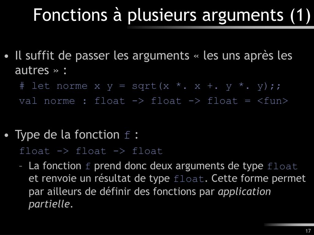 Fonctions à plusieurs arguments (1) • Il suffit de passer les arguments « les uns après les autres » : # let norme x y = sqrt(x *. x +. y *. y);; val norme : float -> float -> float = <fun> • Type de la fonction f : float -> float -> float • La fonction f prend donc deux arguments de type float et renvoie un résultat de type float. Cette forme permet par ailleurs de définir des fonctions par application partielle.