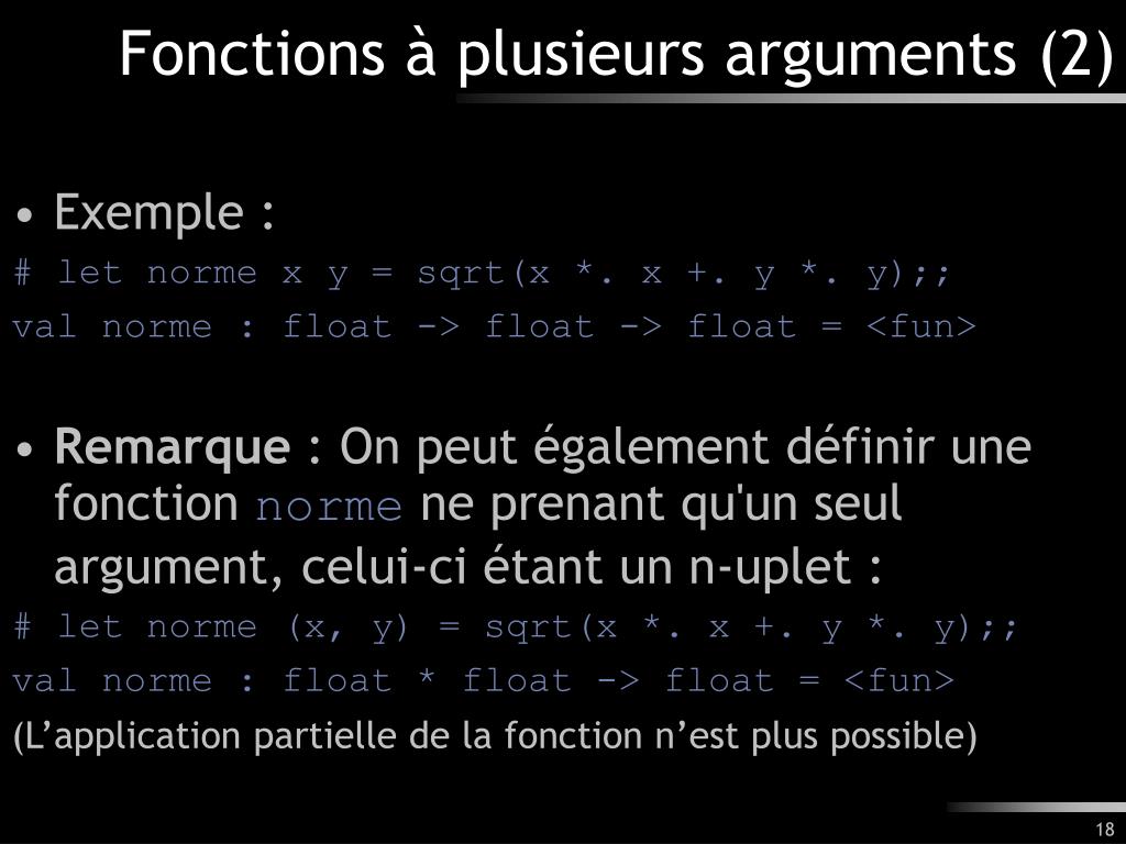 Fonctions à plusieurs arguments (2) • Exemple : # let norme x y = sqrt(x *. x +. y *. y);; val norme : float -> float -> float = <fun> • Remarque : On peut également définir une fonction norme ne prenant qu'un seul argument, celui-ci étant un n-uplet : # let norme (x, y) = sqrt(x *. x +. y *. y);; val norme : float * float -> float = <fun> (L’application partielle de la fonction n’est plus possible)