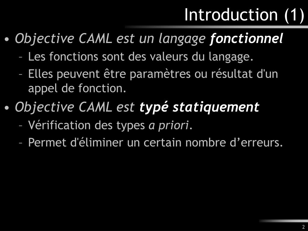 Introduction à Objective-Caml. L3 MI. Introduction (1). Objective CAML est un langage fonctionnel Les fonctions sont des valeurs du langage. Elles peuvent être paramètres ou résultat d'un appel de fonction. Objective CAML est typé statiquement Vérification des types a priori .