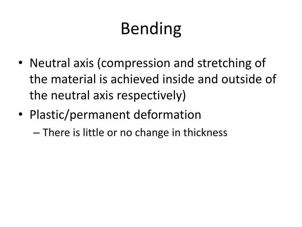 Bending • Neutral axis (compression and stretching of the material is achieved inside and outside of the neutral axis respectively) • Plastic/permanent deformation • There is little or no change in thickness
