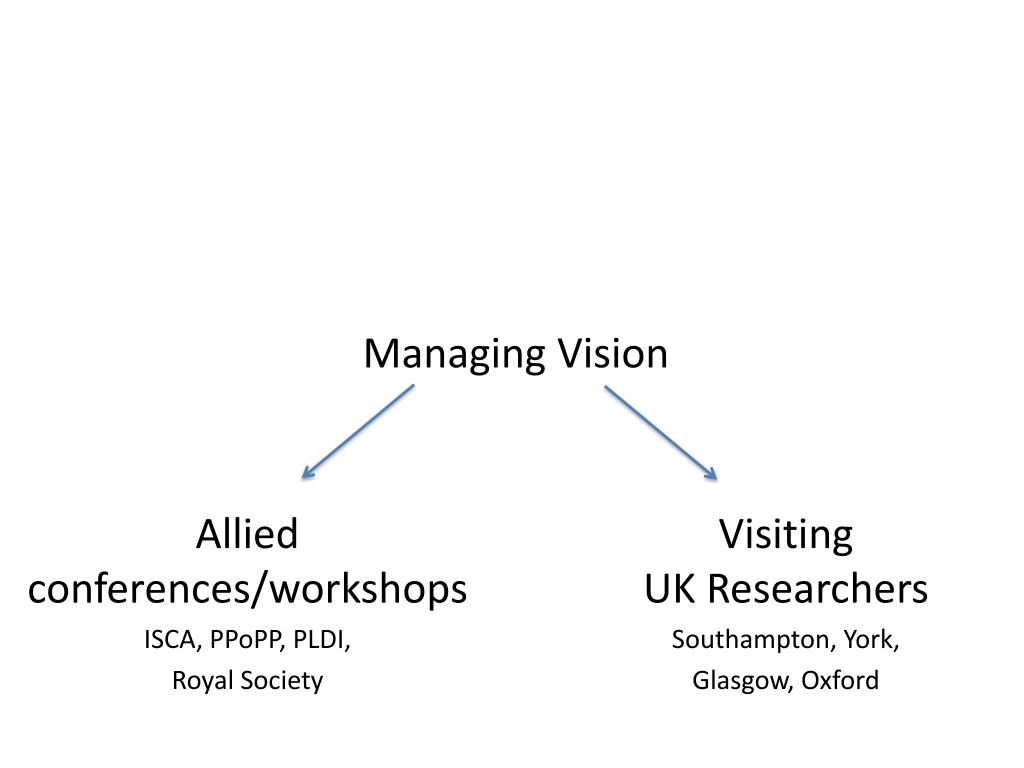 Managing Vision Allied conferences/workshops ISCA, PPoPP, PLDI, Royal Society Visiting UK Researchers Southampton, York, Glasgow, Oxford