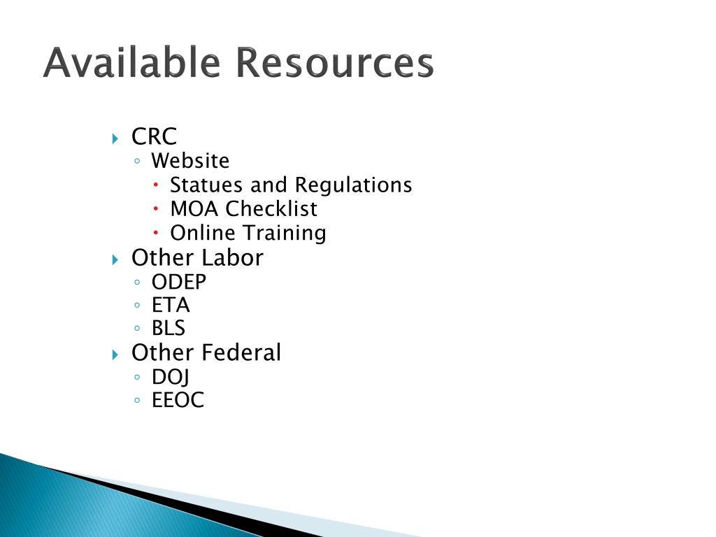 Available Resources • CRC • Website • Statues and Regulations • MOA Checklist • Online Training • Other Labor • ODEP • ETA • BLS • Other Federal • DOJ • EEOC